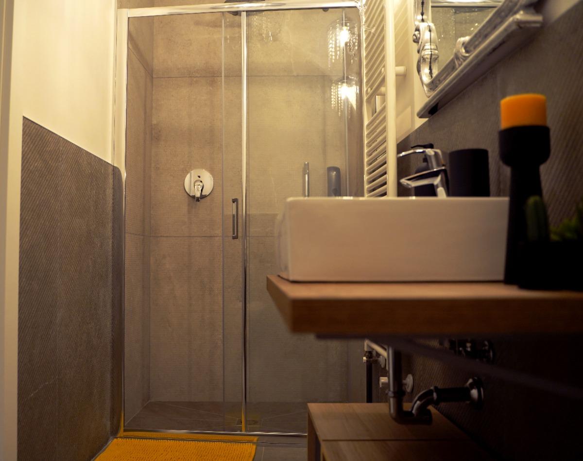 Attraversando il corridoio si accede al bagno con un’ampia doccia filo pavimento di 120x80cm.